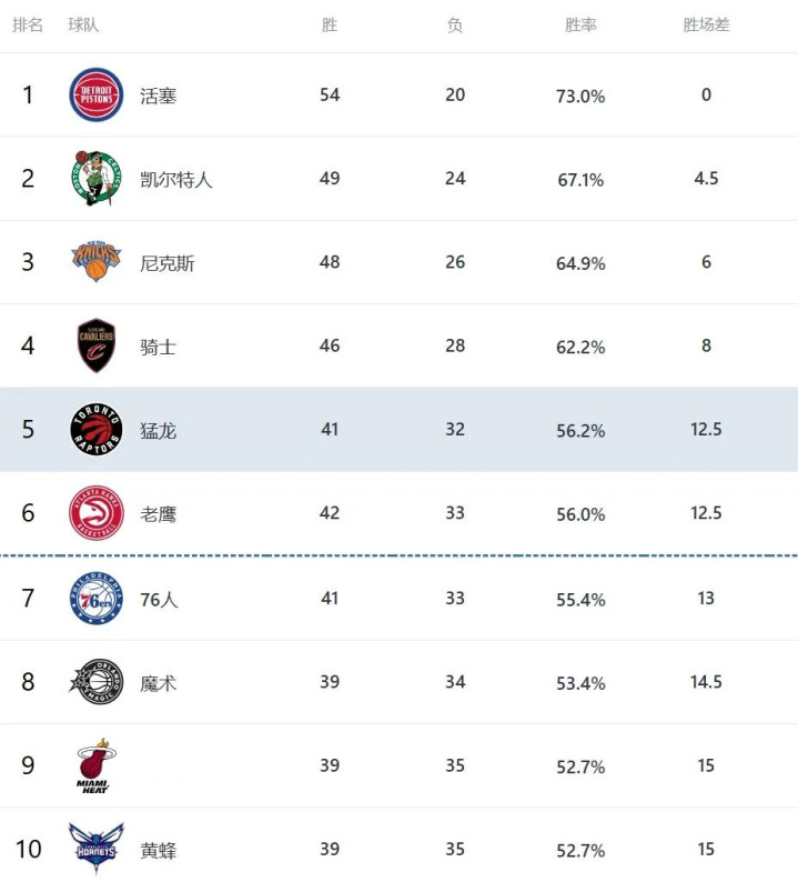 真正的悬念集中在东部5到10位,这一片区堪称大乱斗,没有任何一支球队敢放松警惕。排在第五的猛龙,仅仅领先第六老鹰、第七76人各0.5个胜场,领先第八魔术2个胜场,就算是第十的黄蜂,和猛龙也只差2.5个胜场,这意味着,只要随便输一场球,排名就可能断崖式下跌,甚至直接丢掉直接晋级季后赛的机会。要是不慎跌到第九或者第十,附加赛只有一次机会,但凡发挥失常一场,整个赛季的努力就全部付诸东流,所以这几支球队,后续每一场都要拼尽全力,丝毫不敢懈怠。