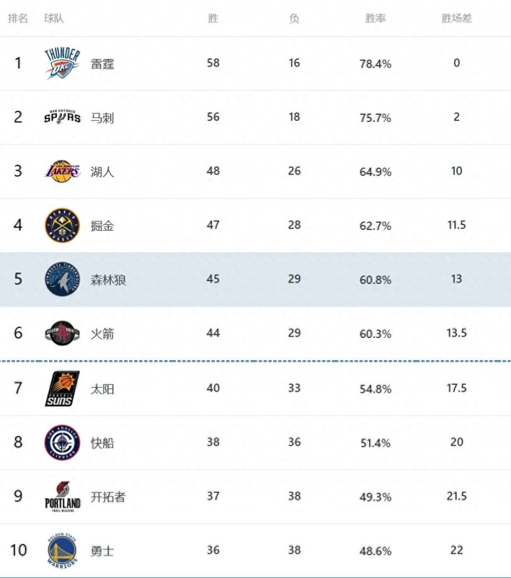西部3到6位的排名更是胶着到离谱,各队之间胜场差微乎其微,丝毫不敢掉以轻心。排在第三的湖人,只比第四的掘金多出1.5个胜场;掘金又领先第五的森林狼1.5个胜场;森林狼则比第六的火箭仅多0.5个胜场,几支球队咬得极紧,现阶段没人敢打包票能稳住现有排位。要知道常规赛只剩8场左右,每一场输赢都能改写排位,后续3到6位的争夺只会越来越凶。不过好在,这几支球队前六的位置相对稳妥,就拿火箭来说,足足领先第七的太阳4个胜场,暂时不用担忧跌出前六、掉入附加赛区。