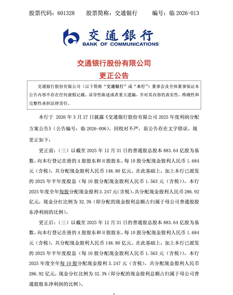 3月30日晚间,交通银行发布更正公告,对前期披露的2025年度利润分配方案进行修正,核心原因系原公告存在文字校对失误,未对分红表述进行准确核对。